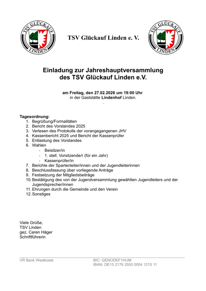 Der TSV Glückauf Linden e. V. lädt alle Mitglieder herzlich zur Jahreshauptversammlung 2026 ein.