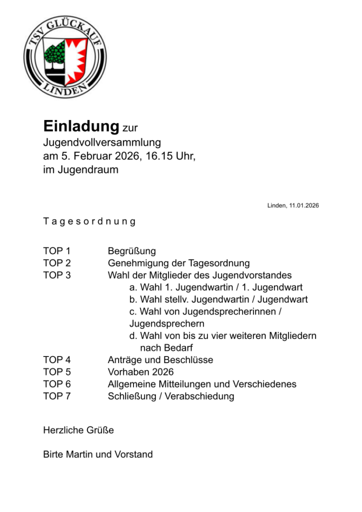 Auf der Tagesordnung stehen unter anderem die Wahl des Jugendvorstandes, Planungen für das Jahr 2026 sowie Raum für Anträge, Ideen und Wünsche.