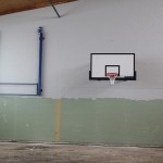 Die Sportgeräte sind an der Wand vormontiert und die Spielpfosten haben ihren neuen Platz erhalten. Die Bodenhülsen sind gesetzt und einbetoniert.